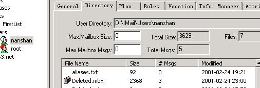 答:在上问中,“Total Size”为已有所有邮件的总大小(字节);“Total Msgs”为已有邮件的总数;“Files”为已有文件的总数。