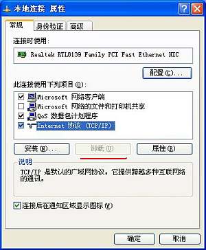 在Windows XP中默认安装了TCP/IP。但是,如果出了网络问题想卸载后重新安装TCP/IP就不容易了:在“本地连接”属性中显示的此连接使用下列项目列表中单击Internet协议(TCP/IP)项,您将发现卸载按钮不可用(被禁用)。