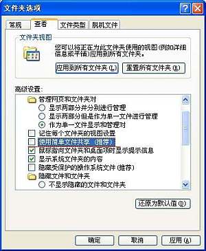Windows 2000操作系统中用户在设置文件夹的共享属性时操作非常简便,只需用鼠标右击该文件夹并选择属性,就可以看到共享设置标签。而在Windows XP系统设置文件夹共享时则比较复杂,用户无法通过上述操作看到共享设置标签。具体的修改方法如下:打开"我的电脑"中的"工具",选择"文件夹属性",调出"查看"标签,在"高级设置"部分滚动至最底部将"Use simple file sharing (Recommended)"前面的选择取消,另外如果选项栏里还有"Mickey Mouse"项也将其选择取消。这样修改后用户就可以象使用Windows 2000一样对文件夹属性进行方便修改了。