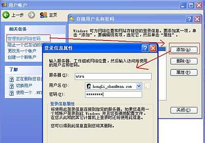 由于WinNT内核的操作系统,在访问远程计算机的时候,好像总是首先尝试用本地的当前用户名和密码来尝试,可能造成无法访问,在这里把用户密码添加进去就可以了。
