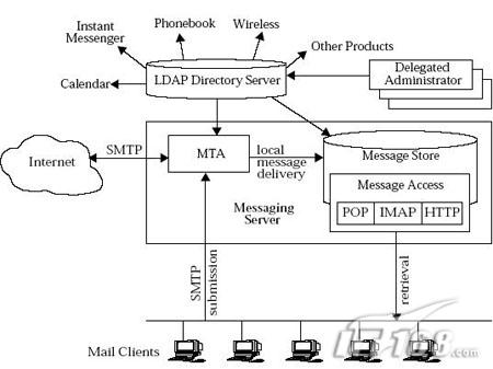 iPlanet Messaging Server (邮件服务器)产品Directory和Messaging之间的关系如图所示: