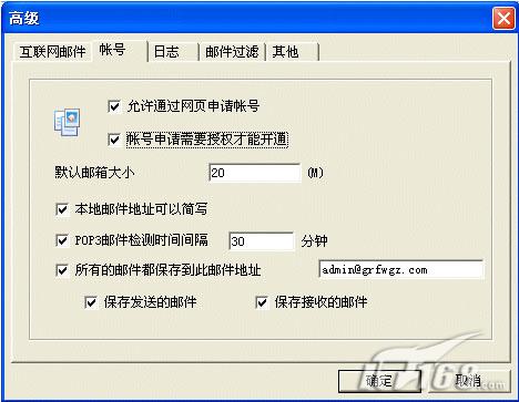 (3)单击“高级”按钮,在打开的对话框中选择“帐号”选项卡,如图3所示。在这个对话框中可以设置用户申请帐号的方式,以及是否可以简化帐号输入,检测邮件时间间隔。最重要的是要选择“所有的邮件都保存在此邮件地址”复选项,然后在后面的文本框中输入一个邮箱地址(一样可以是本邮件服务器创建的邮箱),另还需选择“保存发送的邮件”和“保存接收的邮件”这两个复选项。这样管理员就可以在邮件接收客户端通过这个邮箱查看公司所有用户发送、接收的邮件,实现提问网友的第二个要求。然后单击“确定”按钮即完成邮件服务器的域名设置了。其它选项按默认设置即可,读者朋友也可自己设置。