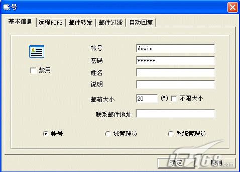 (4)在主界面上单击“新帐号”按钮,打开如图4所示对话框。在其中就可以输入或配置要创建的邮箱帐号、密码、邮箱大小、邮箱类型等信息,只需输入帐号@符号前的部分。单击“确定”按钮,即可把新建的帐号加入了邮件服务器中了。