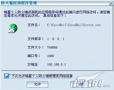 (5)杀毒软件和防火墙的配置。因为如果不进行正确配置的话,就可能不能正常启动POP、SMTP服务,因为它们的通信会与杀毒软件或防火墙的相应通信端口发生冲突。除此之外,如果要用到Web Mial功能,则还需要用到一些其他端口,总之在防火墙上要开放以下端口:25(SMTP), 110(POP3), 53(DNS), 80(HTTP), 8011(Admin), 5353(MX)。在一些个人防火墙中,通常通过一些简单的设置即可打开这些端口。如诺顿防火墙的配置界面如图5所示。瑞星防火墙的相应配置界面如图6所示。