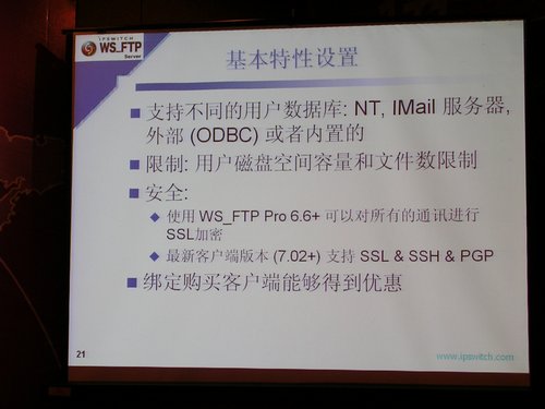 美国Ipswitch公司的朱晓昭(Judy Niewenhous)女士向大家讲解了目前美国Ipswitch公司的主要产品:
