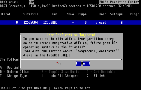 为了保证与FreeBSD共存的系统能够启动,默认情况下FreeBSD会保留一部分磁盘空间(64 cyl)。对于单一操作系统的计算机来说,这是完全没有必要的。分区时按Shift+F可以选择不使用这个特性,不过这种情况下,除了彻底毁掉这套FreeBSD之外,恐怕就没有其他方法能够从这块硬盘上引导其他操作系统了。为了完全使用磁盘空间,我选择了不保留预留空间。