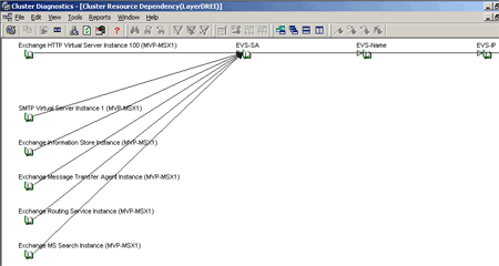 ClusDiag最大的优点之一就是对群集资源依赖性的图形化呈现。有了这种强大功能的帮助,你就能够看到每一个创建资源的依赖性是什么样的。正如你在图5中所看到的,下面的这些组件依赖于EVS-SA(系统助理)资源:
