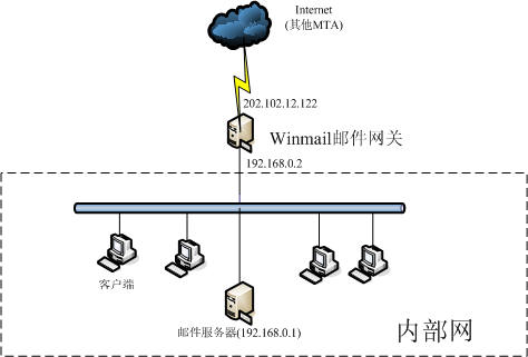 以上配置完成后,应该能收到 internet 的邮件了。至于你的邮件服务器如何发信,你可以选择通过网关发信,也可以直接递送出去,具体设置需要看你的邮件服务器软件了。 当你的邮件服务器放在公网上的时候,也可以使用 winmail 做网关来过滤垃圾邮件和病毒邮件, 需要两个外网IP。 图如下: 所有发往邮件服务器的邮件先经过邮件网关进行过滤,再通过网关发到邮件服务器,邮件服务器可以直接发送邮件,也可以选择网关进行转发。 当然,也可以把winmail邮件网关和邮件服务器安装在一台机器上,这样的话,需要修改邮件服务器的smtp端口,然后在 winmail 的直接外域递送中设置相应的smtp端口。 邮件服务器及邮件网关都放在内网的情况,图如下: 邮件网关架设好了,请看下面相关文章设置winmail邮件网关来进行垃圾邮件和病毒过滤, 通过Winmail中的 SMTP, Queue 日志查看过滤情况。 我在发件人黑名单里设置了test@amaxit.vicp.net这个用户,然后从这个用户发了封信到test@mycompany.com,系统日志显示如下, 下面是我选中了通过dns检查发送者邮件地址中的域名,而amaxit.vicp.net这个域名是不存在的。日志显示如下: 下面是使用了helo检查的日志 还有可以拒绝一些发垃圾邮件的ip地址或ip地址段,来拒绝垃圾邮件,功能较多,不能一一道来,赶快去架设一个试试吧。