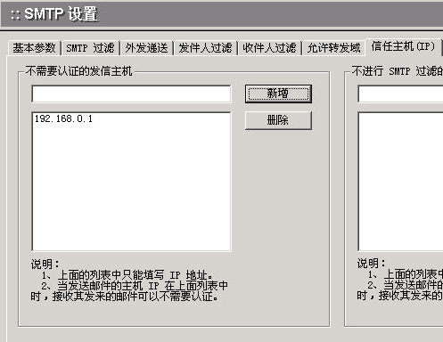 在信任主机IP中,把你的邮件服务器的IP 192.168.0.1加入到不需要认证的发信主机列表中,这样你的邮件服务器发往网关的信件就不需要用户认证了。如图: