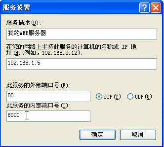 补充:如果IIS服务使用的端口和Windows防火墙的映射端口不全是默认的“80”,那么我们就要新建服务发布选项,完成IIS服务的发布。如IIS服务使用的是“8000”端口,Windows防火墙的映射端口使用“80”。在服务标签页中点击“添加”按钮,弹出“服务设置”对话框(图2),在“服务描述”栏中为该服务发布选项设置一个名称,如“我的Web服务器”,接着在“在您的网络上主持此服务的计算机的名称或IP地址”栏中输入IIS服务器的IP地址,选中“TCP”单选项,然后在“此服务的外部端口号”栏中输入“80”,也就是Windows防火墙的映射端口,在“此服务的内部端口号”栏中输入“8000”,这是IIS服务器所使用的端口号,最后点击“确定”按钮,完成IIS服务的发布。