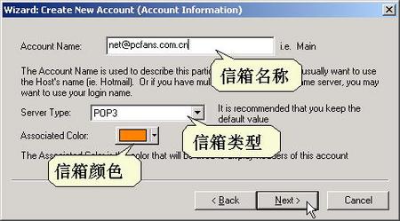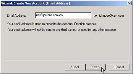 在Email Address(邮箱)中输入邮箱账户(如net@pcfans.com.cn),单击Next按钮打开(如图3)所示窗口中