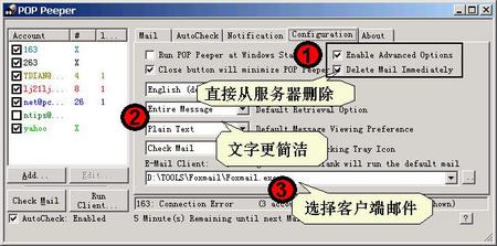 并在打开的窗口中选中Enable Advanced Option(启动高级设置),然后再选中下方Delete Mail Immediately(立即删除邮件)复选框。再单击2号下拉列表框,选择Plain Text(文本)作为邮件显示格式,单击3号下拉列框旁边的...按钮选择我们使用的电子邮件程序(如Foxmail)。