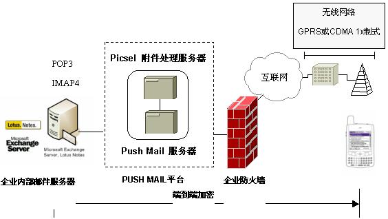 企业在其内部放火墙内安装PUSH MAIL平台,并在移动终端上安装相应的PUSH MAIL客户端软件,可以将企业邮箱用户现有的EMAIL帐号延伸到手机上,不改变用户的使用习惯,可以浏览邮件的附件。采用端到端的加密措施,确保邮件的安全性。