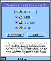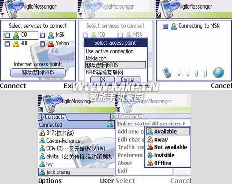 Agile Messenger是一款时下最流行的即时通讯软件,它支持与ICQ、 AOL、 Yahoo!、 MSN、 QQ等实时通讯软件的 同步连接。用户只需要安装Agile Messenger一款软件,就可以登陆MSN,QQ,ICQ等帐户,与好友和同事保持实时的联络。Agile Messenger目前拥有适合多种手机的版本,用户只需根据自己手机的类型,选择相应的版本安装即可。