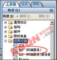 为了便于管理,我需要在校内或校外的其他计算机上用“远程桌面”登录到我的ISA服务器上来。可是ISA服务器设置好后,却无法使用远程桌面从其他计算机登录ISA服务器。按照DNS问题处理的思路,也应该是ISA 2004策略的问题,经实验证明可以通过增加访问规则解决。远程桌面使用的是“协议→远程终端→RDP(终端服务)”协议,端口为3389。方法是创建一个“内部”和“外部”都可以访问“本地主机”的规则,在“此规则应用到”中选择“所选的协议”,然后为其添加“远程终端→RDP(终端服务)协议”(图1)。