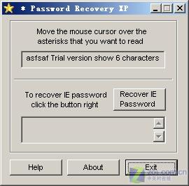 APRXP使用很简单,运行后可以看到光标周围会增加一个光圈,这时把光标移动到星号密码框上,APRXP就会自动弹出并成为当前窗口(如图4),在窗口上面的提示框中将会显示出这个星号后面隐藏的密码。如果想显示IE浏览器中的密码,则单击“Recover IE Password”按钮,APRXP会自动搜索所有打开的网页中的密码,并在下面的方框中显示出来。