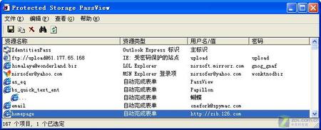 大家都习惯于使用自动保存密码功能保存上网时的邮箱、论坛或商城等密码,但若忘记了密码,如果想修改密码或是在别人的电脑上使用就无法登录了。前面提到的APRXP虽然也可以显示出IE中的星号密码,但它仅适用于当前打开的网页中有密码的情况,对于这些已经保存在系统中的密码就不起作用了,这时需要使用另外一款专用工具——Protected Storage PassView(下载地址:http://hdt.downloadsky.com:8080/down/ha_pspv161_zib.zip),它可以帮用户找出系统中保存的IE自动完成密码、自动完成表单密码、受保护站点密码、OE密码、Outlook密码和MSN Explorer密码。