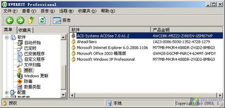 运行EVEREST后,在左边的功能导航菜单项下面依次打开“软件→授权”分支,这时在右边就可以看到系统中已经安装的这些软件的序列号(如图6),包括Windows序列号、Office序列号、ACDSee序列号或Nero序列号等等。