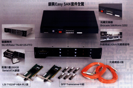 本文以银兴科技的Easy SAN为例为大家介绍如何组建光纤存储区域网。该方案包含一台2U的TN-6012S-FFD磁盘阵列,一台Brocade SilkWorm 3252 光纤交换机、两块LSI 7102XP HBA卡、6组光纤模块(SFP Transceiver)、4条光纤跳线以及软件光盘。