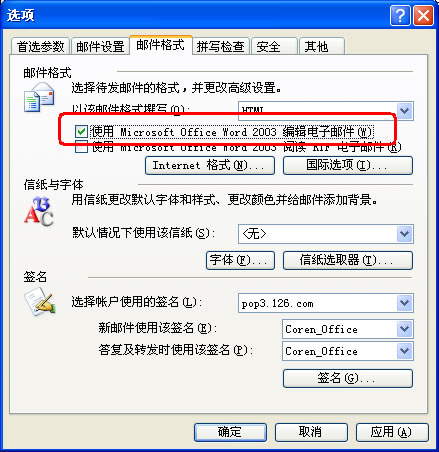 (1)开启Microsoft Outlook 2003,选择【工具】菜单中的【选项】命令,打开“选项”对话框,然后单击“邮件格式”选项卡,在“邮件格式”选项区域中选择“使用Microsoft Office Word 2003编辑电子邮件”选项,如图1所示。