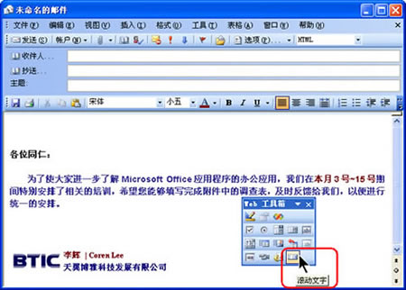 (4)设置完成后,单击【OK】按钮,这样在您的邮件中就插入了一段循环滚动的文字,以提醒收件人的注意。同时,单击邮件中的滚动文字控件,您还可以设置该控件中文字的大小、字体、颜色等,如图4所示。