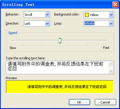 (3)此时,打开“Scrolling Text”对话框,设置滚动文字的属性,包括滚动文字的方向、背景颜色、循环方式、文字内容、滚动速度等。所有设置都可以在该对话框的预览窗格中体现,如图3所示。