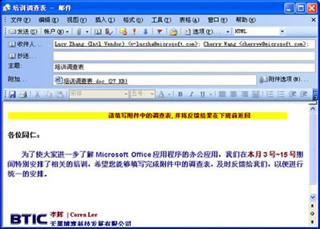 下面,在Microsoft Outlook 2003中创建一个新的电子邮件,同时,Outlook将自动启动Word作为电子邮件的编辑器。这样,我们就可以在新邮件对话框中编写邮件的内容了。此时,如果希望能够在邮件中加入能够提醒人们注意的动态文字,则可以按照如下步骤操作: