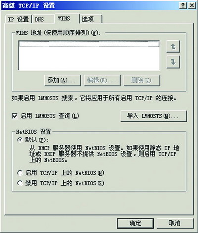 Windows XP在默认状态下会打开Netbios和SMB(Server Message Block,服务器信息块),这些协议用于用户共享文件、磁盘、目录和打印机。如果你不需要它们,可以用后面讨论的办法关闭它们。先来看看如何关闭Netbios,打开“控制面板” “网络连接”中的网卡设置窗口,进入TCP/IP设置项的高级设置窗口,在WINS选项卡中选择“禁用TCP/IP上的NetBIOS”,这样一来就可以去掉Netbios-ssn服务(如图8所示)。