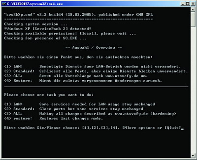 使用自动脚本 如果不想自己一项项地去调整各项服务,可以考虑一下使用预定义好的脚本程序。这里介绍的脚本来自www.ntsvcfg.de,这是一家专注于优化Windows安全配置的德国网站。你需要下载的脚本程序是http://www.ntsvcfg.de/svc2kxp.cmd。下载之后双击该文件即可,它会打开一个Windows命令行窗口(如图9所示),列出了4个服务配置选项:LAN、Standard、ALL、Restore。你可以按数字键进行选择,LAN适用于需要使用局域网的机器,Standard适用于带有Internet连接但没有局域网的独立机器,ALL则使用了该网站讨论的最为激进的优化方案。其中的Standard比较符合本文推荐的优化方案,这个脚本会将Security Accounts Manager、TCP/IP NetBIOS Helper和Windows Management Instrumentation的运行状态改为“手动”。如果你对修改后的效果不满意,可以选择Restore恢复之前的设置。除了不能关闭Netbios之外,这个脚本的自动化程度非常不错。由于该脚本使用了sc.exe来启动和终止服务,如果你的机器上没有sc.exe,可以到http://www.dynawell.com/reskit/microsoft/win2000/sc.zip下载并解压到Windows/System32下即可。