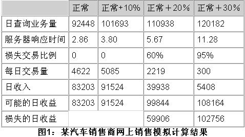 就某一商业Web站点而言,人们通常会认为,日访问人数越多,说明销售的潜力越大,潜在的购买者越多。但统计结果向我们显示的却是另一种结果。随着日访问人数的增加,销售量上升到一定程度后,反而下降。图1给出的是某汽车销售网站网上销售的模拟计算结果。注意,当网站日查询业务量为正常的120%或更高时,访问的服务时间明显增长,使得日收益反而比正常情况下降很多。