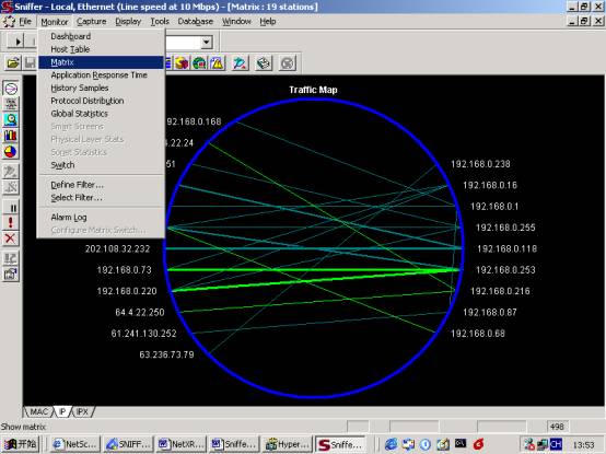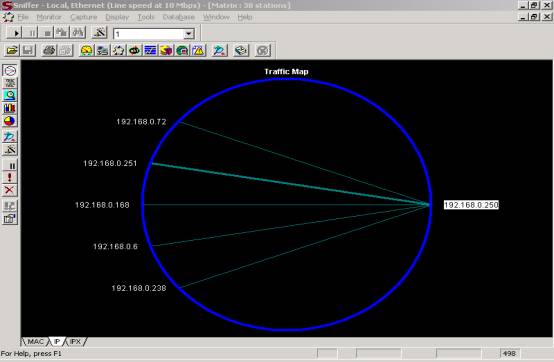 该兰色圆中的各点连线表明了当前处于活跃状态的点对点连接,也可通过将鼠标放在IP地址上点右键àshowselectnodes查看特定的点对多点的网络连接,如下图,表示出与192.168.0.250相连接的IP地址