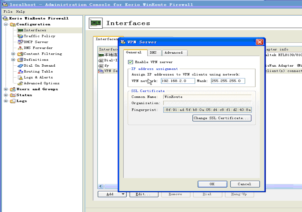 完成了VPN服务的配置后,还要将它发布到公网中,以及创建访问策略。但KWF内置的VPN服务器却与众不同,它的公网发布和访问规则创建是自动完成的,不需要网管手工设置。用户配置完VPN服务后,KWF控制台的“Traffic policy”框体中会自动创建两条关于VPN服务的通信策略,其作用就是允许外部的VPN用户访问VPN服务,以及允许VPN 客户和总部网络之间相互访问。