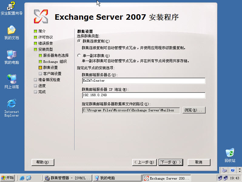 下一步进入群集设置,这里我们选择默认设置群集连续复制,如果选择单一副本复制请了解kb898790相关内容;为什么选择群集连续复制呢?请了解到http://download.microsoft.com/do ... _RelNotes_zh_CN.htm;群集连续复制保证了邮件不会丢失在传输过程中,保证了邮件的完整性。在安装Ex2007群集的过程中大家可能发现了下图中已经出现了邮件服务器群集名和群集地址,这些设置在Ex2003时都是需要在群集管理器设置了,在这里设置有什么用呢,在群集安装成功后大家会看见群集为什么在Ex2007设置的原因。