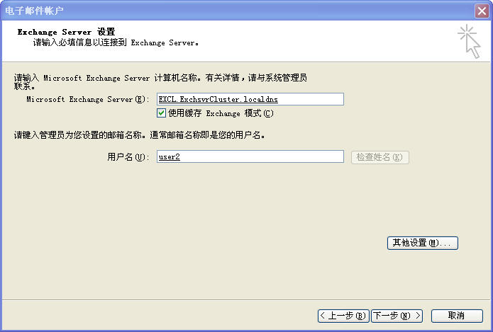 在完成Ex2007群集后,我们现在需要设置outlook是否可以使用Ex2007。首先我们到群集服务器创建一个用户,这里我们新建一个用户user2