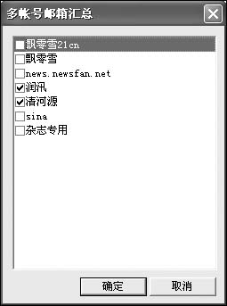通常情况下,我们在邮件客户端中只能收、发一个邮箱或所有邮箱的E-mail,但Becky!则不然,它能够任意收、发多个邮箱。点击菜单栏“邮件→多账号邮箱汇总”,在弹出对话框中勾选指定邮箱复选框,如图1所示。确认操作后,再执行“多账号发送及接收”命令即可。
