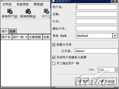 户和组群”选项,接着打开“Red Hat用户管理器”对话框,点“添加用户”按钮,在接着出现的“创建新用户”窗口中输入用户名及密码即可,如图所示: