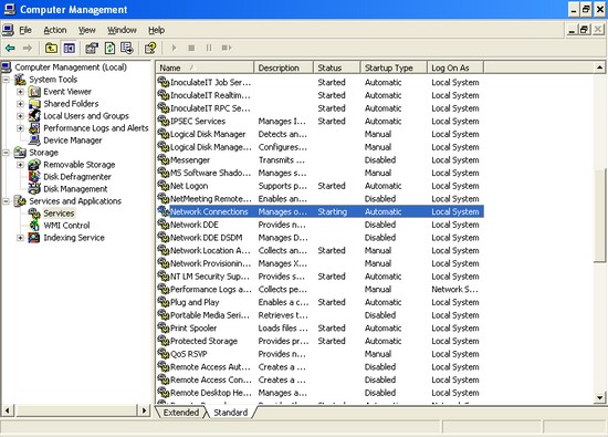 我再次回到服务中来,因为我确信问题一定出在这里。我检查了每项服务的状态和启动类型,甚至那些可能导致我现在碰到的问题。我甚至还将这些服务与同一网络中其他位置上工作正常的安装过SP2的Windows XP Pro设备逐一进行比较,也没有任何发现。