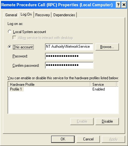 图F:RPC的登录帐号在安装SP2以后被设为NT Authority\Network Service