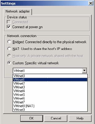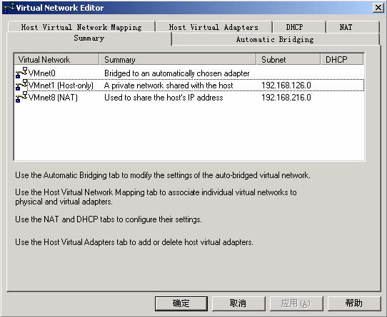 两个虚拟网络分别是VMnet1 地址为192.168.126.0 和VMnet8 地址为192.168.216.0,主操作系统windows2000, 安装了两个虚拟网卡,地址分别是192.168.126.1 和192.168.216.1, 主操作系统和虚拟系统的网络关系是Custom 模式,如图1-2: