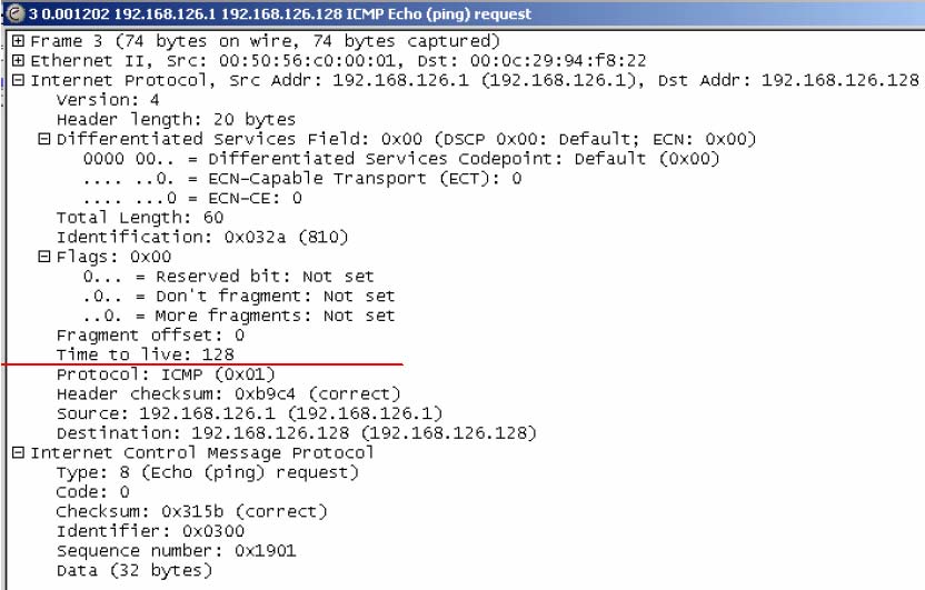 我们主要看看TTL,从图1-13 和1-14 的比较来看,图1-13 中的TTL 是128,而图1-14 中的TTL 却是64,什么原因呢?