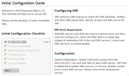 ORF在执行DNS黑名单、SURBL和其它基于DNS的过滤需要DNS查询,因此在ORF至少配置一个DNS服务器。DNS服务器需要能够解析外部域名和递归查询,推荐使用本地DNS服务器。