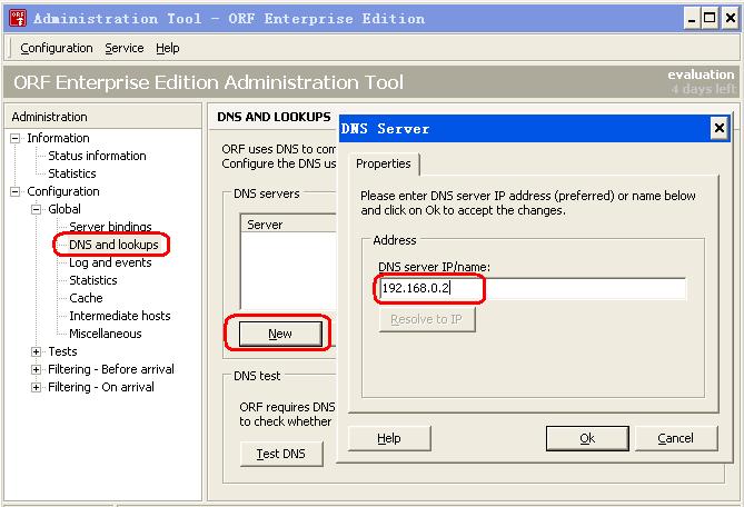 从管理树里进入Configuration->Global->DNS and Lookups,因为ORF会自动检测可用的DNS服务器,在列表里可能已经有一个或更多的DNS服务器,请根据需要删除不必要的服务器,或再添加修改DNS服务器。