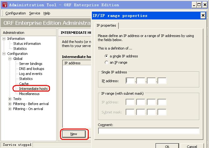 如果邮件服务器和ORF是装在不同服务器,则需把邮件服务器的IP加入到Intermediate Host列表里,使ORF完全信任邮件服务器发来的邮件而不做过滤。