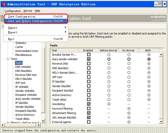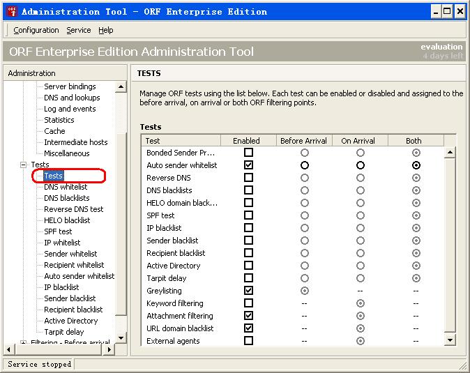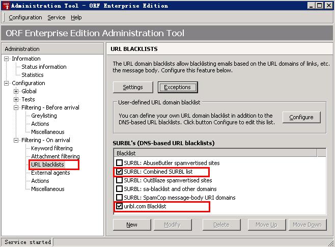 ORF提供了几个垃圾邮件检测手段,推荐使用Greylisting、URL domain blacklist、Attachment filtering和Auto Sender whitelist组合过滤。