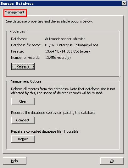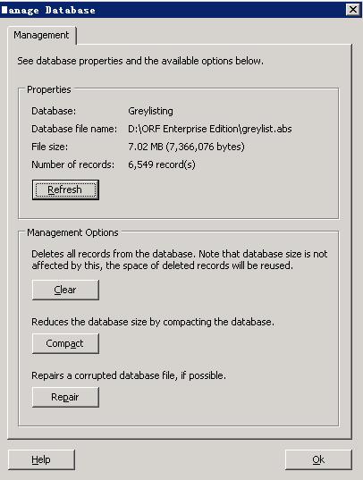 (4)Greylistng数据库记录外来邮件的活动历史,在管理器里可对数据库进行清除、压缩、修复操作.