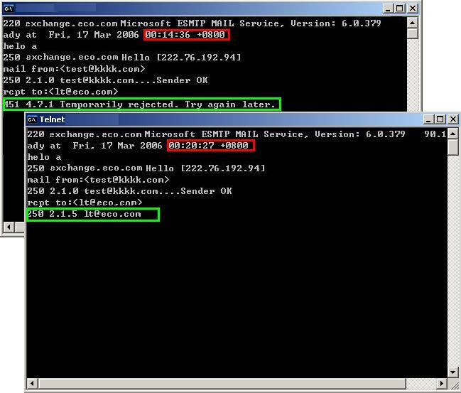(6)手工测试Greylisting, 登陆到smtp服务器IP测试smtp指令rcpt to能否通过