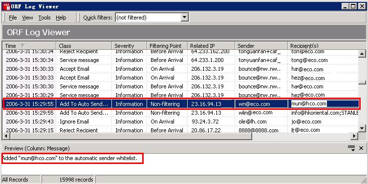 (7)在日志查看器里可看到外发邮件的收件人被收集到自动发件人白名单里.