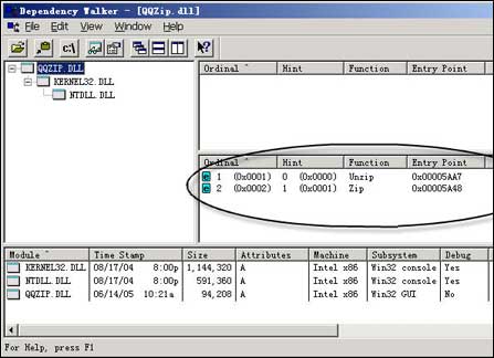 第三步:函数输出表的Function栏中即为输出函数的名称(见图1),在QQZip.dll中共发现了2个函数:Unzip、Zip。因此可以判断该DLL在QQ程序中负责压缩和解压缩的任务。