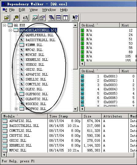 还是拿QQ来作为例子,在Depends中打开QQ.exe,这时界面左侧的树状列表中显示的就是QQ.exe调用的DLL列表(见图2),如果展开这些DLL分支,还会发现其他的DLL,这就说明QQ调用的这些DLL文件还有可能(几乎是肯定)再调用别的DLL。这就好比买了一台新的DVD机,可能其中用的机芯是SONY的,而这个机芯里的一个小电容又有可能是别的公司的,这是同样的道理。
