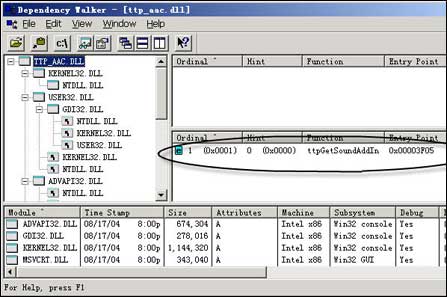 “千千静听”的插件目录在该软件安装目录下的Addin子目录下,程序的插件目录一般都会以“Plugins”、“Addin”来命名。在“千千静听”的插件目录中有许多DLL文件,比如tt_asf.dll、tt_rm.dll等,从文件名中就能看出这些DLL是用来让这个播放器支持各种不同类型的音频文件的。同样,用Depends打开这些文件,你就会发现这些文件的输出函数表中都包括一个同样的函数:ttpGetSoundAddIn(见图4)。